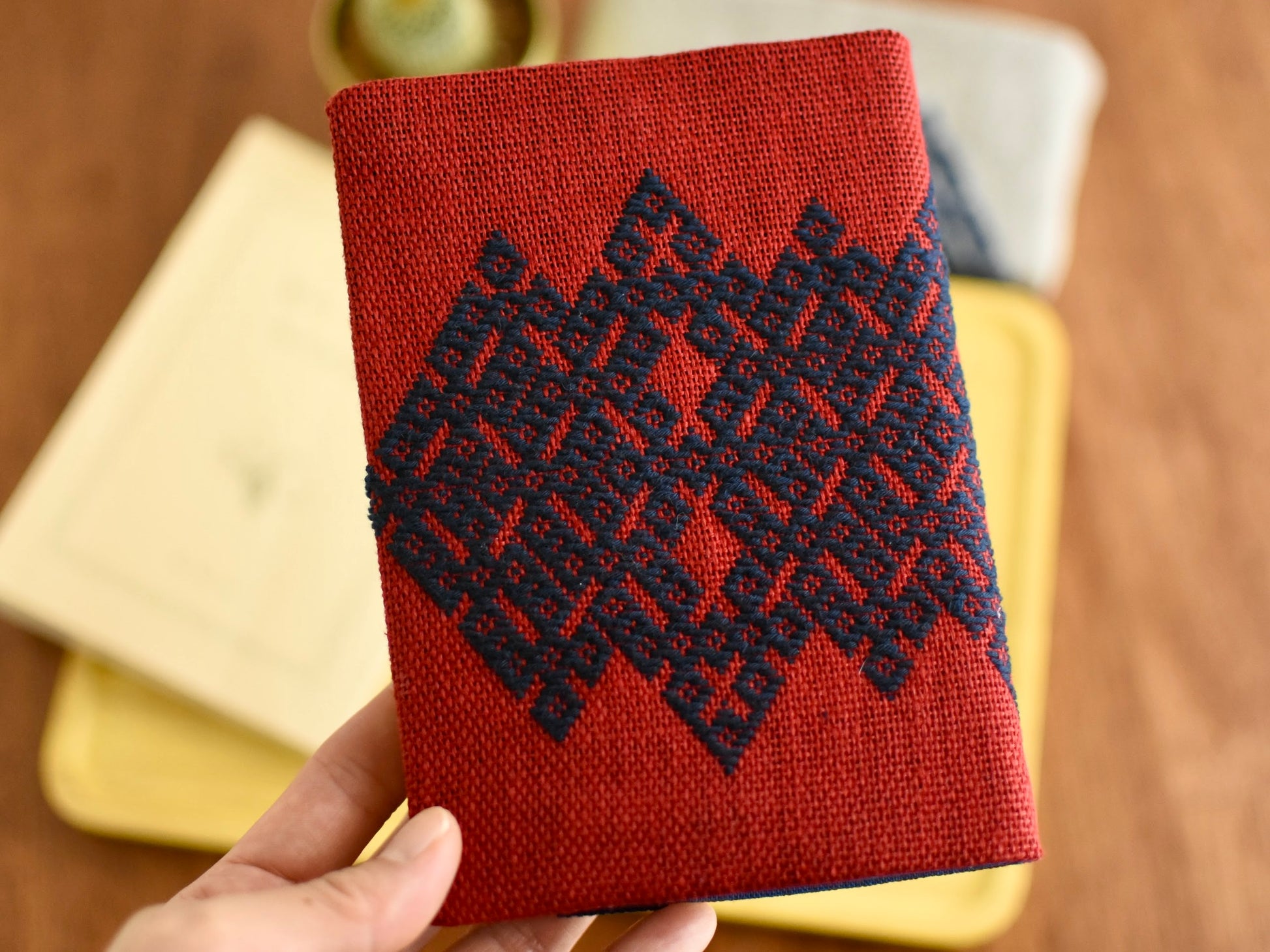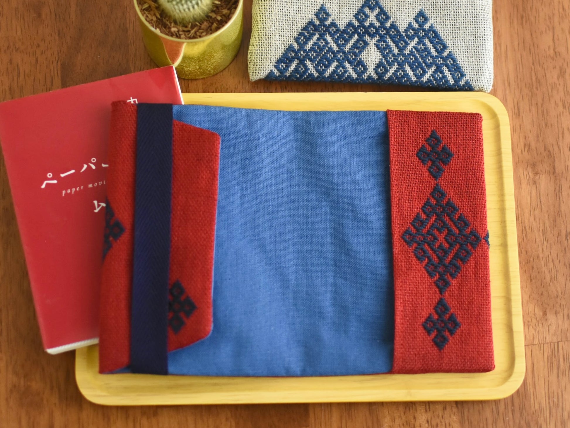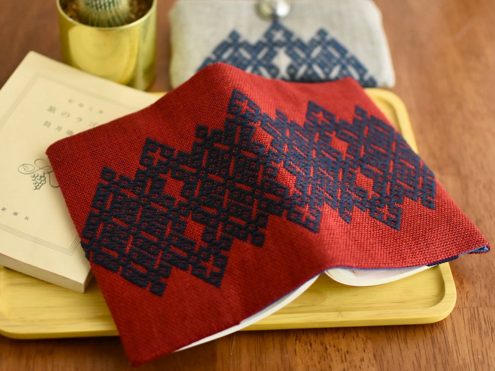 こぎん刺しの文庫本サイズのブックカバーキットです。モドコ(基礎模様)を発展させた図案ですので、こぎん刺しのリズムを楽しみながらお作りいただけます。仕立てが不安な方も安心してお楽しみいただけるよう、丁寧な説明書が付いてきます。