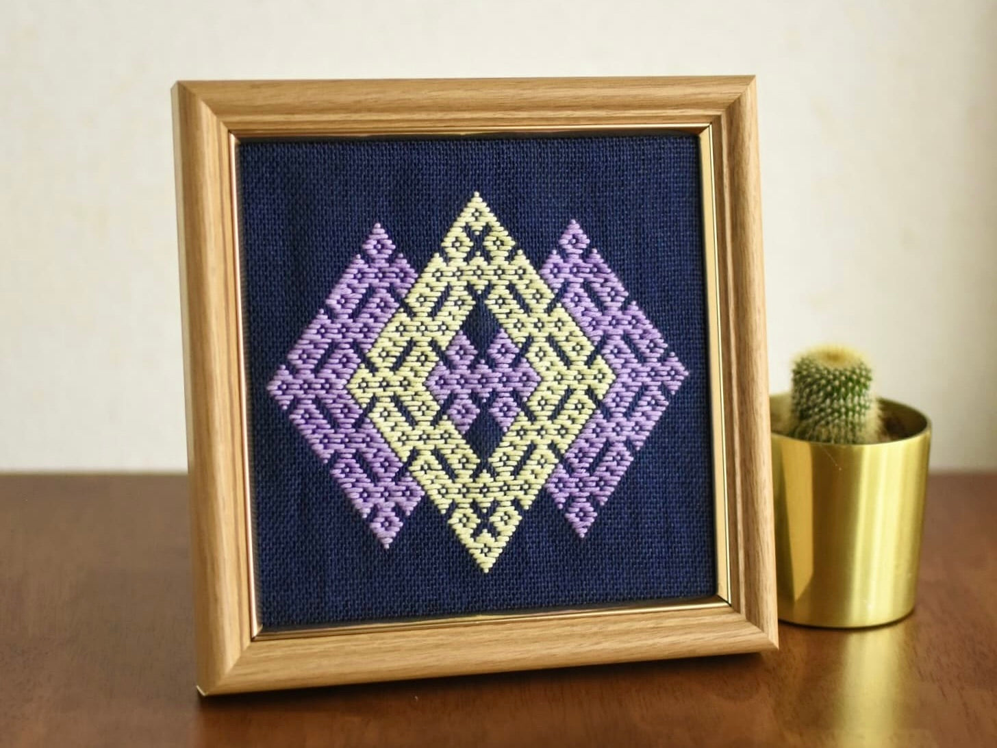 キット8、9の応用図案で、平面な中に階層を表現し、絆を感じられるデザインにしました。半分に折ってメガネケース等に加工してもいいですね。