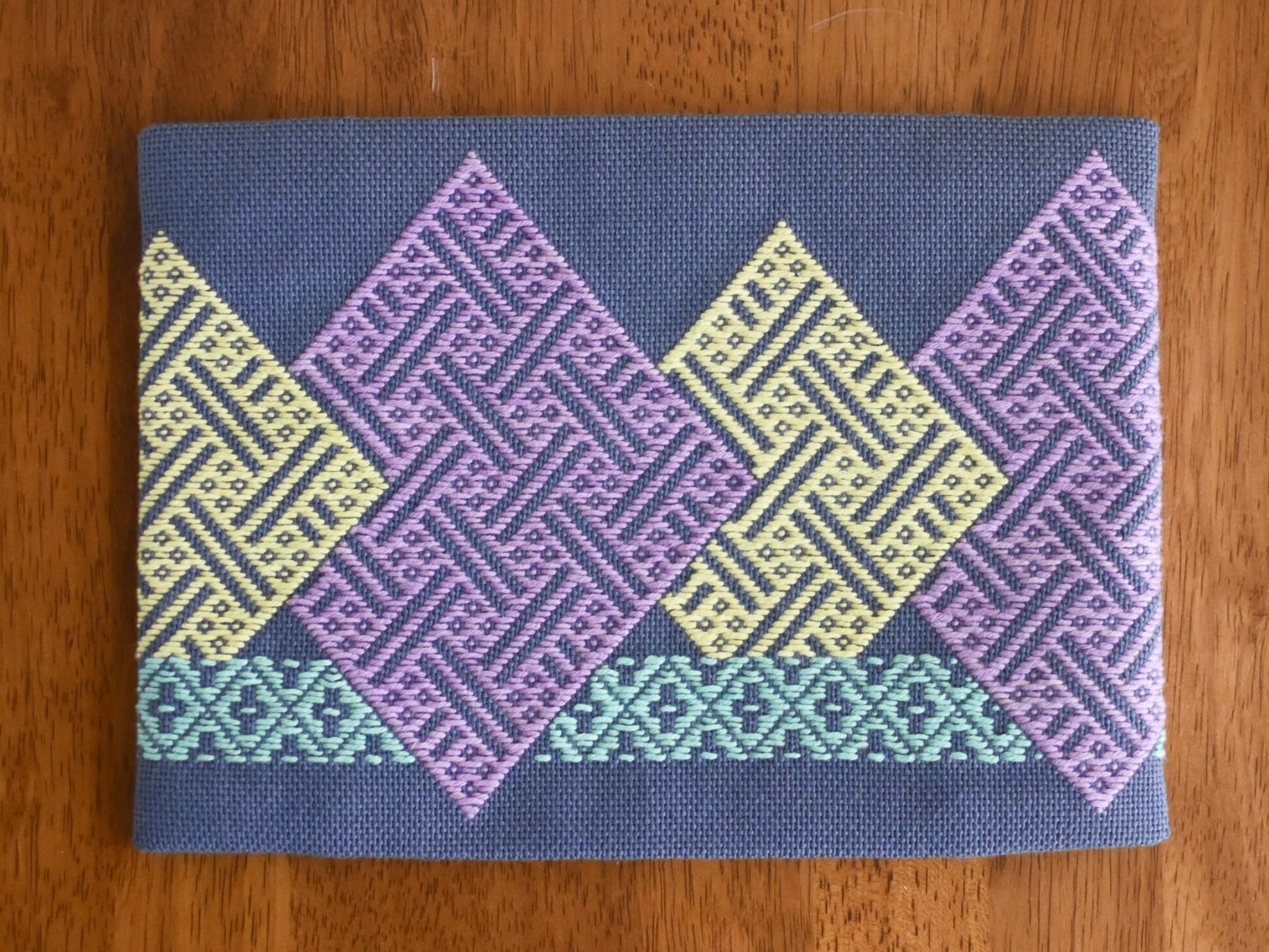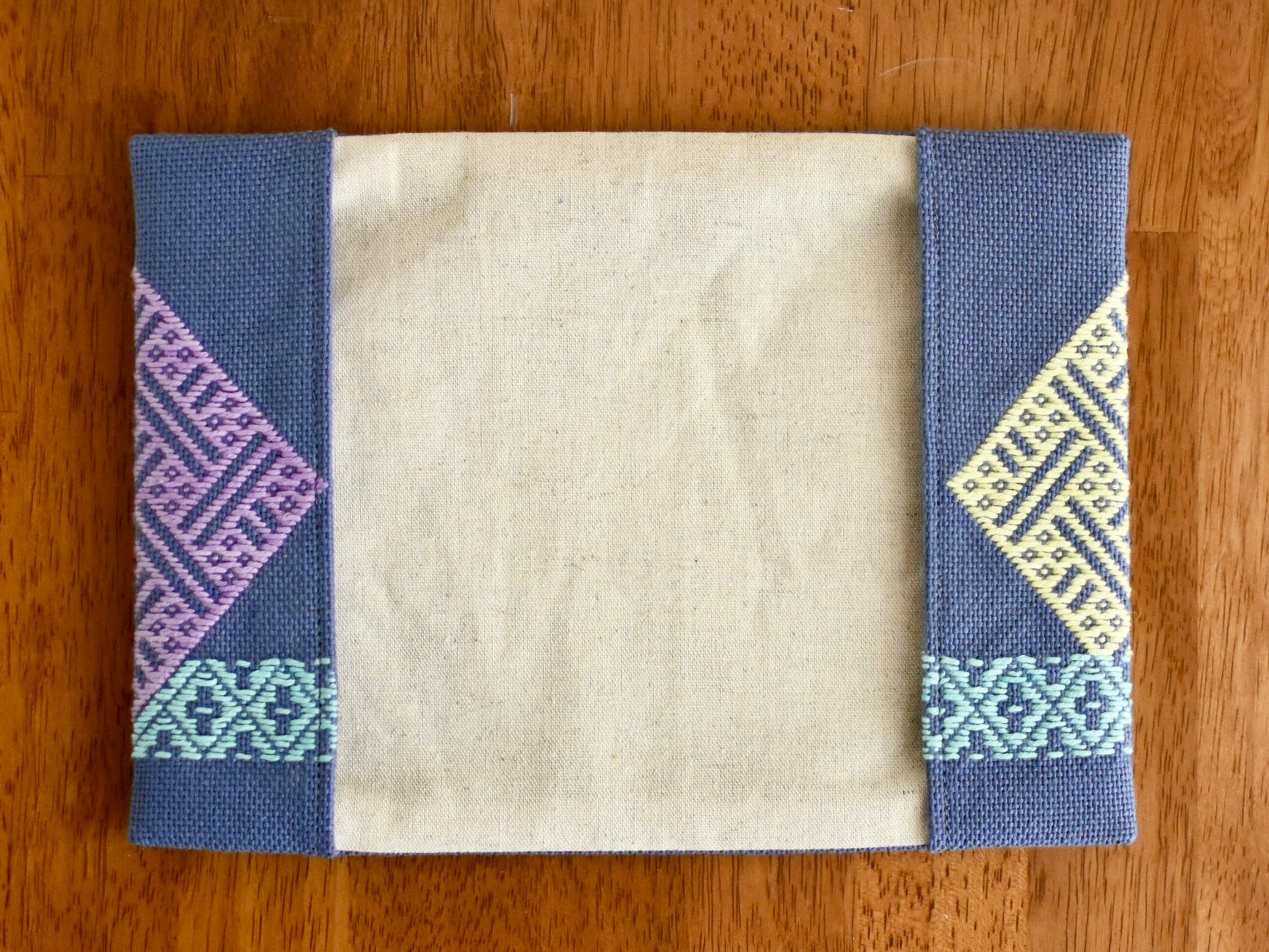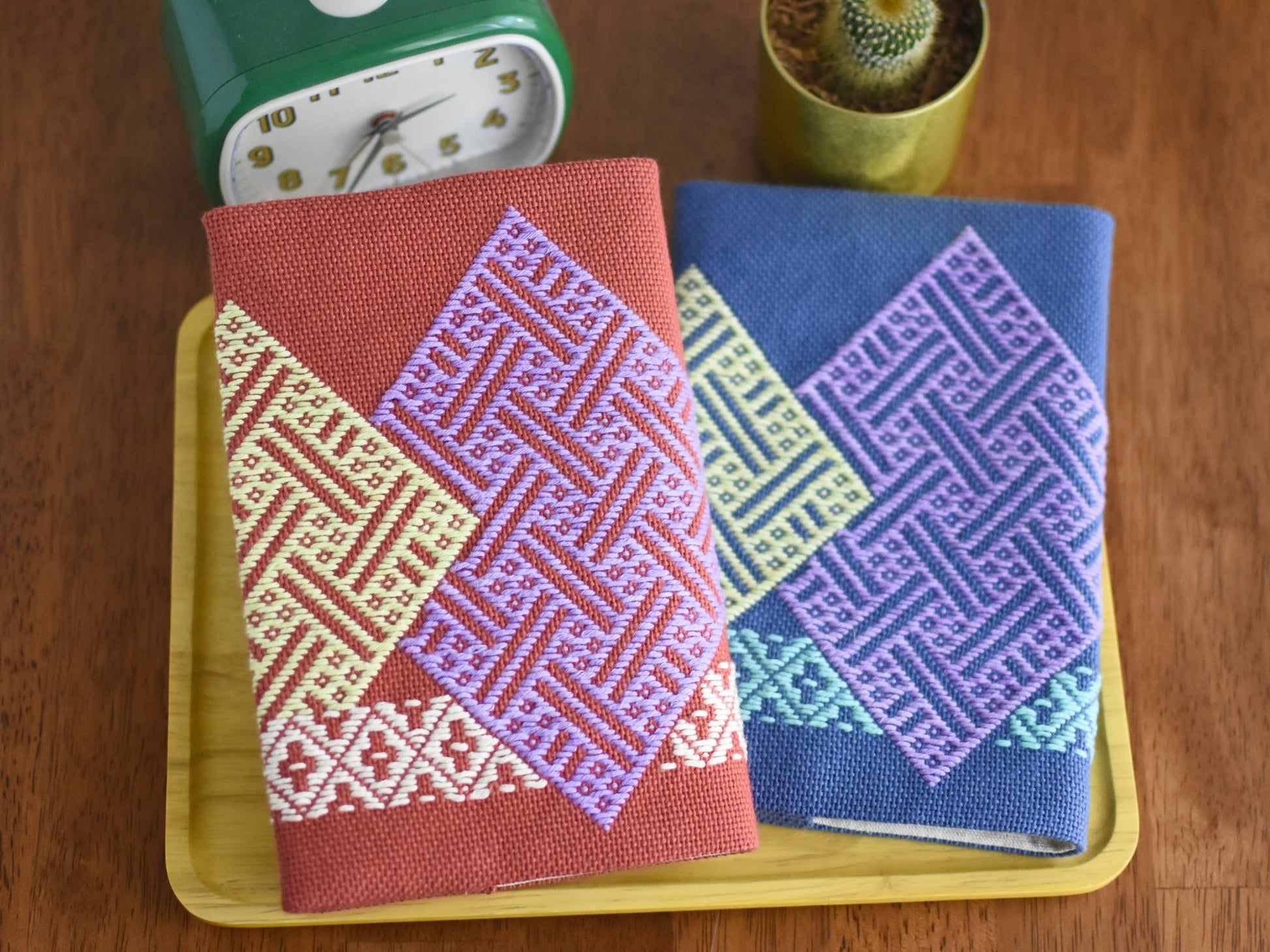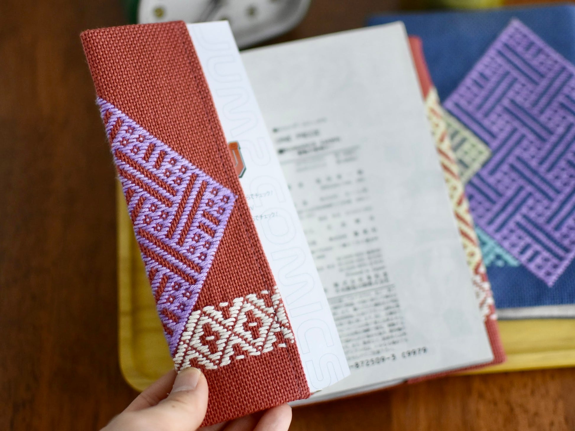 こぎん刺しの新書判(新書判マンガ本)サイズのブックカバーキットです。モドコ(基礎模様)を発展させた図案ですので、初心者の方もこぎん刺しのリズムを楽しみながらお作りいただけます。仕立てが苦手な方も安心してお楽しみいただけるよう、丁寧な説明書が付いてきます。