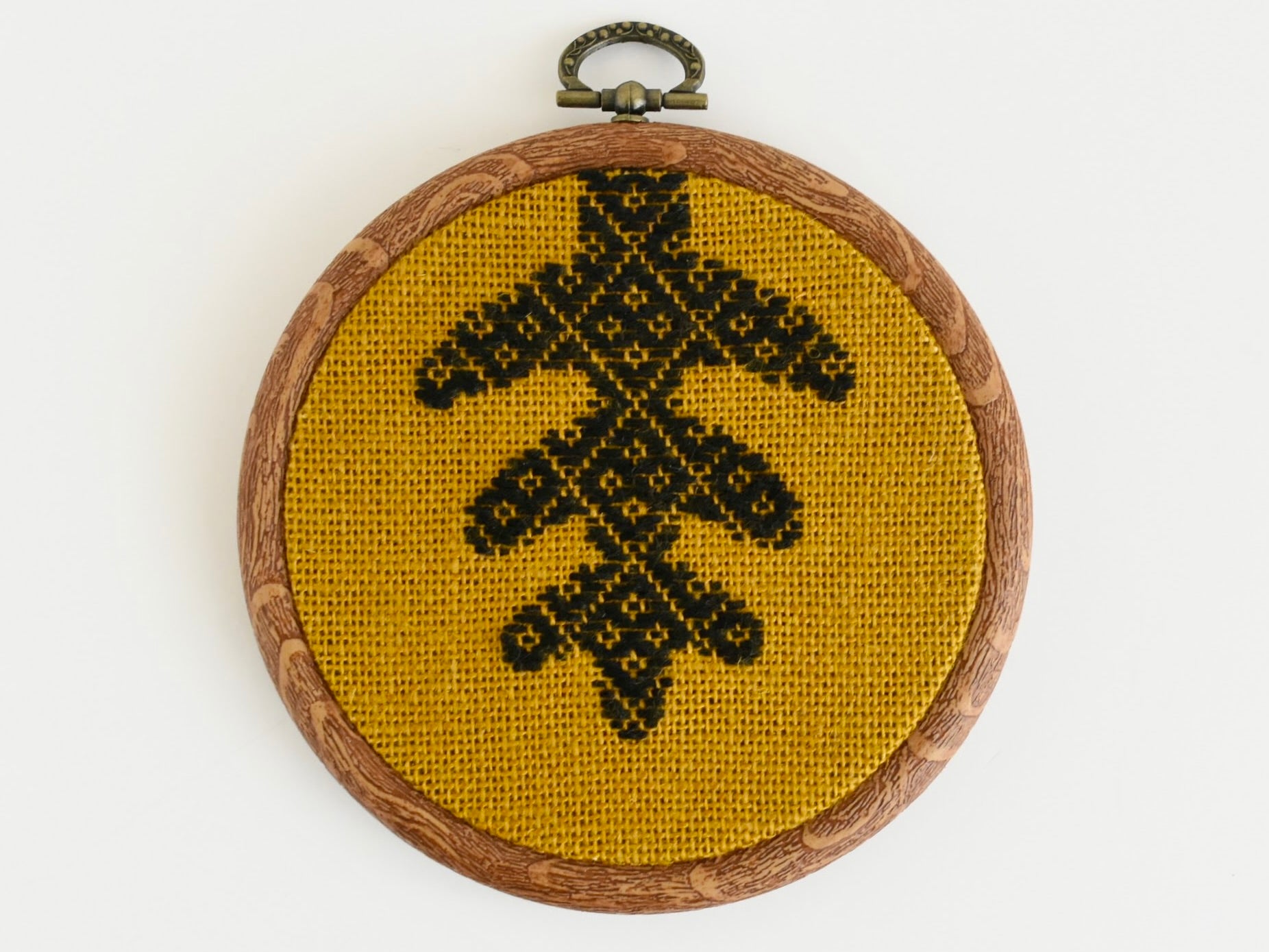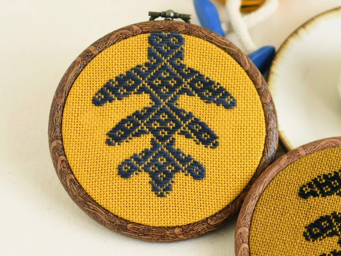 結び花のモドコ(こぎん刺しの基礎模様)のみで構成された図案ですので、初心者の方もこぎん刺しのリズムを楽しみながらお作りいただけます。